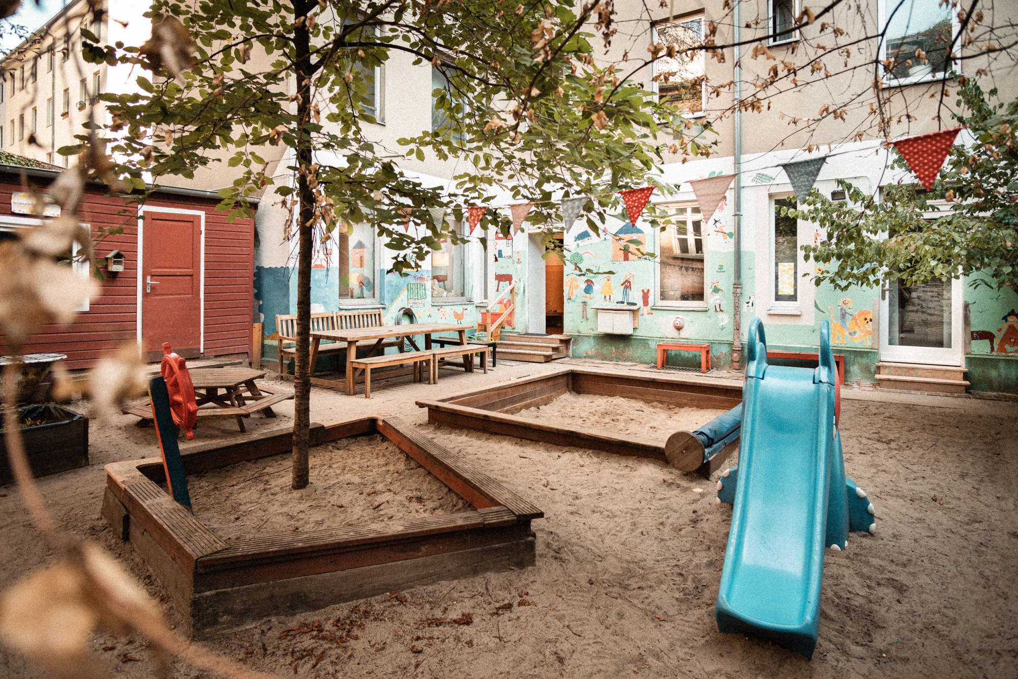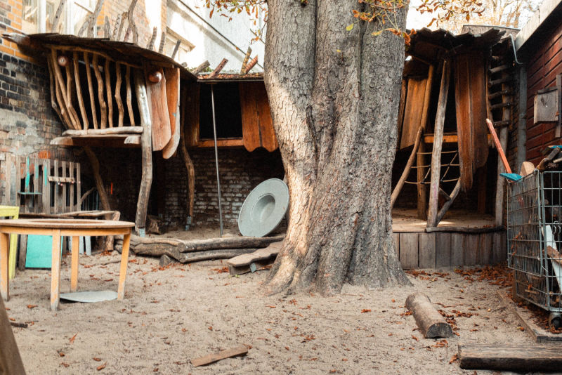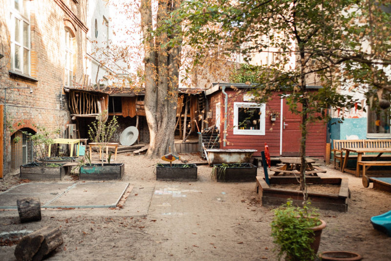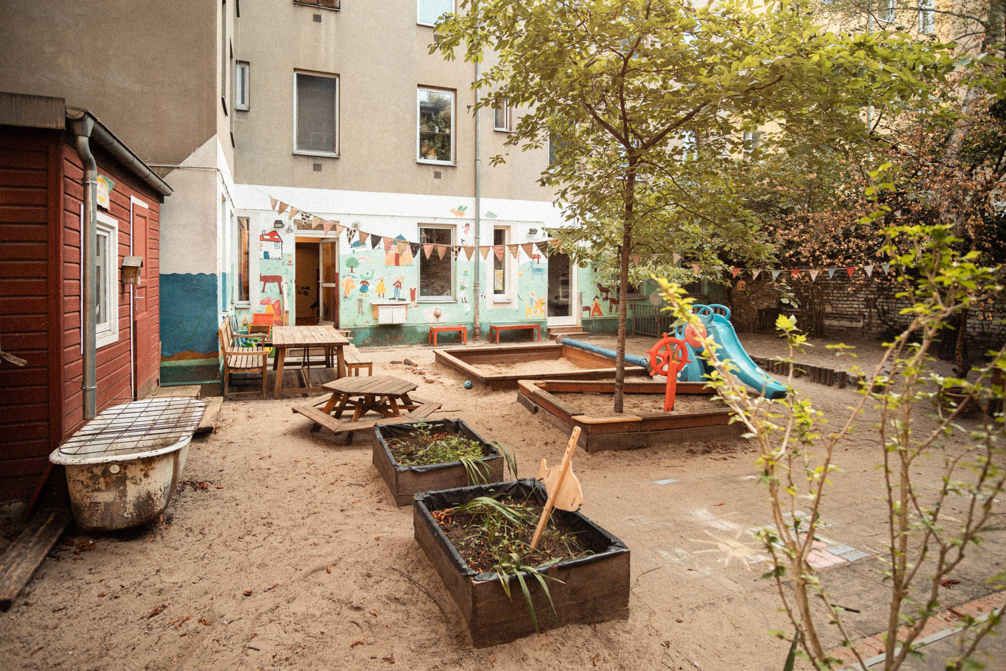 Im Hinterhof ist unser großer Garten, auf den wir besonders stolz sind: Bäume, Schaukeln, Sandkasten, das Baumhaus, der „Pool“, in dem die Kinder im Sommer planschen und natürlich viel Platz zum Toben, Klettern, Rennen, Sitzen, Dreiradfahren und Vieles mehr. Bei regelmäßigen Gartentagen packen auch die Eltern an, um den Garten in Stand zu halten.